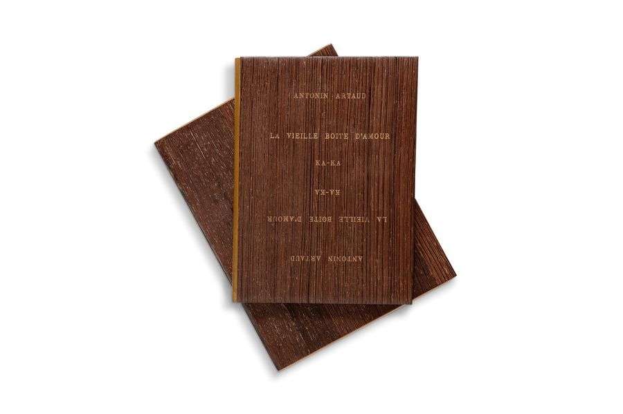TAPUSCRIT signé «Antonin Artaud» avec ADDITIONS et corrections autographes, La vieille boîte d'amour Ka-Ka, Paris 27 décembre 1946| 7 pages in-8 sur 4 feuillets montés sur onglets, reliure bois des îles aux lames articulées, doublures de daim gris, plat sup. titré à l'endroit et à l'envers, dos de veau havane, étui en bois à dos titré (Antonio).