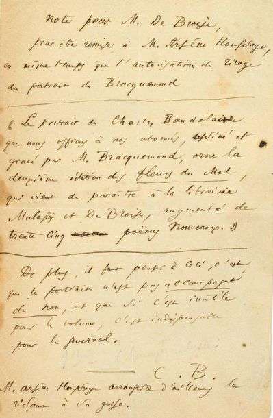 Fleurs du Mal, qui vient de paraître à la librairie Malassis et De Broise, augmentée de trente cinq poëmes nouveaux”. De plus, il faut penser à ceci, c'est que le portrait n'est pas accompagné du nom, et que si c'est inutile pour le volume, c'est indispensable pour le journal». Il ajoute: «M. Arsène Houssaye arrangera d'ailleurs la réclame à sa guise».