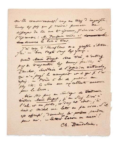 Baudelaire qui séjourne en Belgique depuis le mois d'avril 1864, remercie son correspondant, lecteur chez l'éditeur Michel Lévy, pour la relecture des épreuves de sa traduction des Histoires grotesques et sérieuses d'Edgar Allan Poe, et plus particulièrement de la nouvelle intitulée Le Mystère de Marie Roget. Mille remerciements! Vous me tirez d'angoisse. Toutes les fois que je croirai pouvoir me dispenser de lire une 2e épreuve, j'écrirai sur l'épreuve: M. Parfait relira et donnera le bon à tirer. J'ai reçu d'Honfleur ma propre édition. J'ai un bon texte sous les yeux. Quand Marie Roget sera tirée, n'oubliez pas de transmettre les bonnes feuilles à Pauchet, secrétaire de l'Opinion nationale, qui m'a payé le manuscrit et à qui je l'ai repris. - Prière à lui de publier au plus vite. Ce sera une excellente annonce pour le livre. Hier soir pour me soulager du tintouin Marie Roget, je me suis livré à l'ale et au porto, et dans cet état, j'ai écrit à Michel une lettre un peu vive. S'il est offensé, demandez-lui pardon pour moi. - Encore un merci! (...).