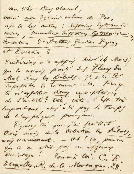 Pym, et Eureka ? Frédéricx m'a appris hier (14 Mars) que tu avais parlé des Fleurs du Mal dans les Débats». Il n'a pas réussi à trouver cela et demande deux exemplaires du journal: «Vite, vite. C'est très important, et je n'ai pas le temps de t'expliquer pourquoi. Figures-toi que j'ai feuilleté trois mois de la collection des Débats, mais vainement.