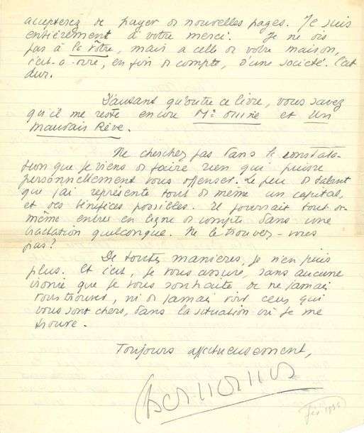 Évangeline - ces types-là ne me semblent pas indignes de leurs frères ou soeurs du Soleil de l'Imposture ou de la Joie. Mais je ferai mieux encore. Vous allez voir»... Dimanche [20 janvier 1935]. Il réclame le retour de son manuscrit pour refaire la seconde partie du roman en cinquante pages, «et la rendre accessible à Monsieur Lebrun lui-même (président patriote de la Super-patrie française, championne de la civilisation gréco-romano-tarasconaise en face de la Barbarie orientale et asiatique, dont la frontière est à Sarrebruck et à Sarrelouis, comme nul n'en ignore). [...] En retour, je m'engage à n'utiliser en rien la sec