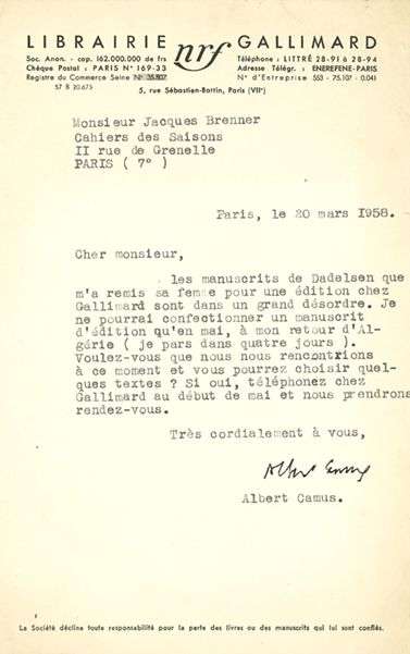 On joint 2 enveloppes autogr. au même| une L.S. de Suzanne Agnély, secrétaire de Camus, réclamant à Brenner les poésies de Dadelsen| et une photographie de Camus (Keystone).