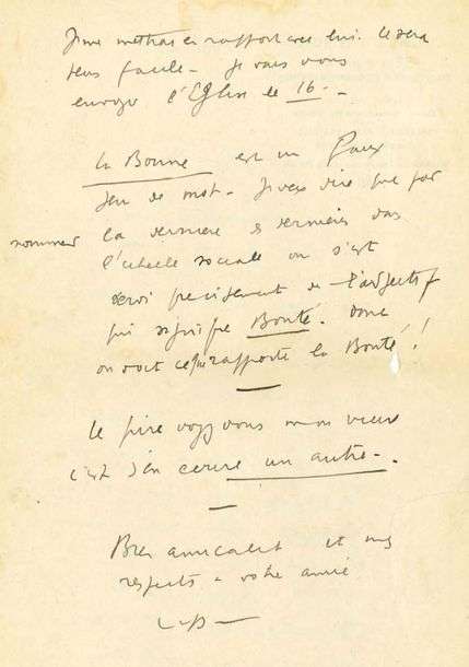 Je vois que la vie s'organise autour de vous. Pour la maison, voulez-vous m'envoyer une adresse d'un Real Estate. Je me mettrai en rapport avec lui. Ce sera plus facile. Je vais vous envoyer L'Église le 16. La Bonne est un faux jeu de mot. Je veux dire que pour nommer la dernière des dernières dans l'échelle sociale on s'est servi précisément de l'adjectif qui signifie Bonté. Donc on voit ce que rapporte la Bonté ! - Le pire voyez-vous mon vieux c'est d'en écrire un autre»...