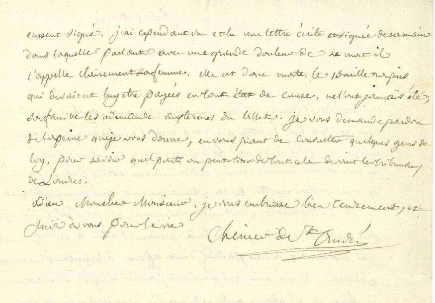 L.A.S. «Chénier de St André», Paris 8 septembre 1790, [à François BARTHÉLEMY]| 1 page et demie in-4.