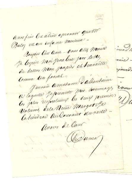 Comédie-Française et l'art en général] contre moi: il y dit entr'autres choses que Madame d'Altenheim dément partout les lettres que vous m'avez écrites - ou plutôt qu'elle m'a écrites en votre nom. Il serait très important pour moi que Madame d'Altenheim voulût bien m'écrire que non seulement ces lettres sont bien de vous, mais encore que c'est elle qui me les a écrites sous votre dictée. Pardon cher ami de vous ennuyer encore: mais la question devient plus grande que jamais, et il faut pourtant que nous en arrivions à nos fins c'est-à-dire à prouver que Mr Buloz est un infâme menteur»... Dumas «travaille comme un forçat», et adresse à Mme d'Altenheim les deux premiers volumes de La Reine Margot| «je la tiendrai au courant du reste»...