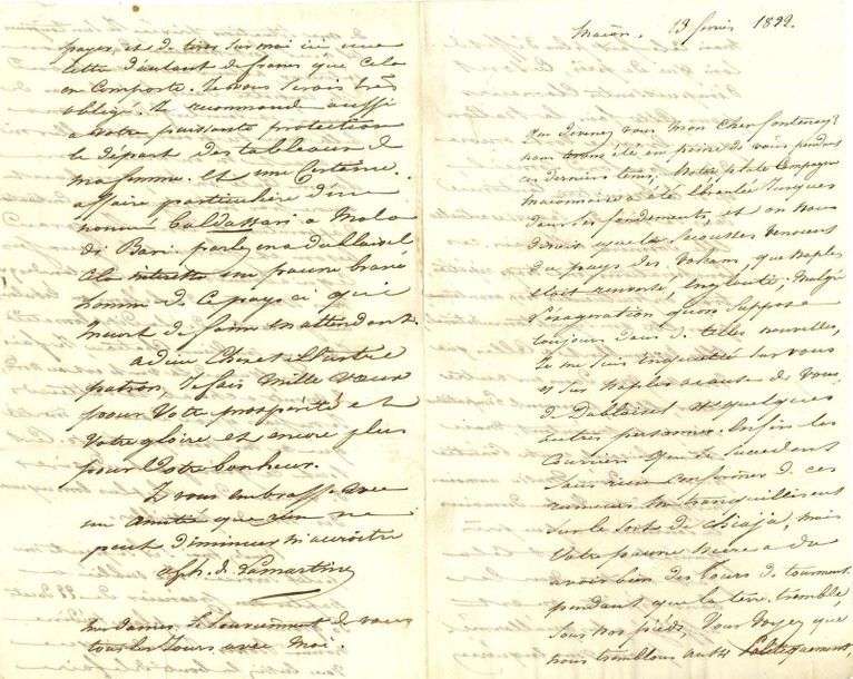 17 L.A.S. («Alphonse de Lamartine», «Lamartine», etc.), et 3 L.A., 1819-1841, à Gabriel de FONTENAY| 53 pages in-4 ou in-8, nombreuses adresses.