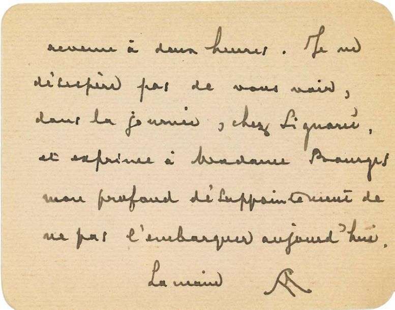 Poniatowski m'invite, par un télégramme, à déjeuner à Fontainebleau et je ne serais pas revenu à deux heures. Je ne désespère pas de vous voir, dans la journée, chez Signoret, et exprime à Madame Bourges mon profond désappointement de ne pas l'embarquer aujourd'hui»...