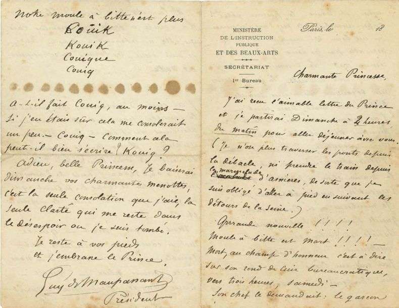 L.A.S. «Guy de Maupassant Président», [février 1880], à une «Charmante Princesse»| 4 pages in8, en-tête Ministère de l'Instruction publique et des Beaux-Arts. Secrétariat.