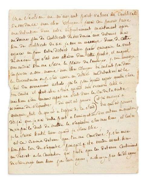 Minute autographe d'une lettre écrite de prison, dans laquelle, le marquis de Sade, arrêté comme suspect contre-révolutionnaire, clame son innocence et demande l'appui de son correspondant pour obtenir la levée des séquestres qui pèsent sur ses biens, en raison de l'émigration de ses fils. Il adresse des certificats de vie qui lui ont été délivrés par sa section parisienne, dont un à faire passer à «Quinquin le veuf» son régisseur de Mazan. (...) Je vous envoie ces pièces à vous-même mon cher citoyen, ne voulant pas dans la circonstance où je suis, écrire au district. Ma détention est le fruit des événémens actuels| j'ai le plus grand espoir qu'elle sera très courte, et peut-être finie quand vous recevrez celle-ci. Mes biens sans aucun raport ne sont dans le cas de la vente, ni même du séquestre| dès qu'il est prouvé (et j'ai envoyé à Quinquin tout ce qui est à l'appui de ce fait), dès qu'il est prouvé, dis-je, que je n'ai nulle part à l'émigration des enfans en question, on n'a pas le droit de mettre le séquestre sur mes biens| et certes je le ferai bientôt lever quand je serai libre. Est-ce comme détenu que l'on me considère? je suis encor bien plus loin du séquestre, puisqu'il a été rendu avant-hier un décret à la Convention qui porte que les détenus continueront de faire régir leurs biens par leurs agens, à charge par lesdits agents d'en rendre compte à la Nation si les détenus sont trouvés coupables (...). Il répète qu'il n'ya donc aucun motif pour mettre ses biens sous séquestre. Tachés de faire passer ma lettre à notre ami G*** [Goupilleau de Montaigu, conventionnel du Vaucluse, ou bien son fidèle avocat, Gaufridy]. Peignés lui ma détresse et priés le de faire l'impossible pour m'envoyer de l'argent. Le calme va renaître| la Terreur n'est plus à l'ordre du jour, c'est la justice et l'égalité qui y sont, et l'on ne souffrira plus que des scélérats, des Robespierre, des Regnier, des paysans, des Héber