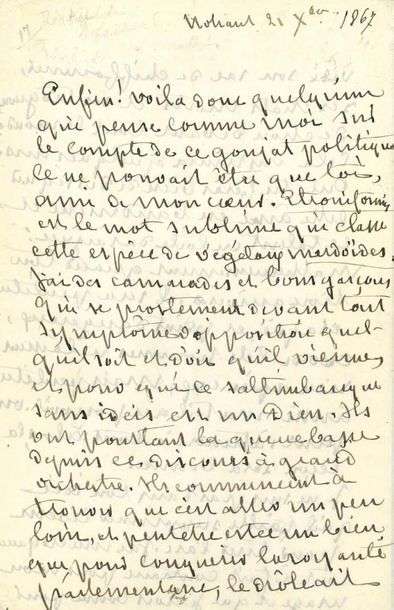 Sand évoque d'abord vigoureusement le discours de THIERS en faveur du Pape et contre l'unité italienne [auquel Flaubert avait réagi: «Peuton voir un plus triomphant imbécile, un croûtard plus abject, un plus étroniforme bourgeois !»]: «Enfin ! voila donc quelqu'un qui pense comme moi sur le compte de ce goujat politique. Ce ne pouvait être que toi, ami de mon coeur. Etroniformés est le mot sublime qui classe cette espèce de végétaux merdoïdes. J'ai des camarades et bons garçons qui se prosternent devant tout symptôme d'opposition quelqu'il soit et d'où qu'il vienne, et pour qui ce saltimbanque sans idées est un Dieu.