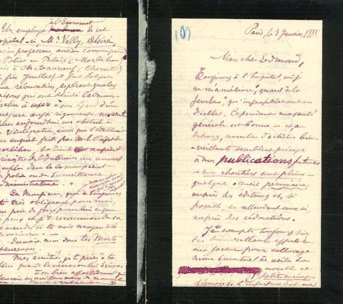 «Toujours à l'hôpital, où je ne m'améliore, “quant à la jambe”, qu'insensiblement en diable. Cependant ma santé générale est bonne - et, au dehors, nombre d'articles bienveillants semblent présager à mes publications futures -mes chantiers sont pleins - quelque accueil pécuniaire auprès des éditeurs et, si possible, en attendant ceux-ci, auprès des rédactions. Je compte toujours sur tes bienveillants efforts en ma faveur pour “collocage” mien éventuel ès asile honorable et petits ménages déguisés, si l'infortune doit me poursuivre à ce point en cette année qui s'entame». Il craint qu'un nouveau médecin le fasse «déloger plus tôt que je ne le voudrais pour mes commodités financières». Il n'aura de l'argent qu'en avril-mai. «Vanier ne pourra disposer d'ici-là, en ma faveur, que de 200 à 250 francs. Quelques articles par ci par là, nouvelles ou vers, pourront grossir un peu cette somme bien modeste, et avec du courage !! Mais à tout hasard, ou plutôt contre tout hasard, je tâcherai de rester ici le plus possible». Il a écrit à ce sujet au Dr