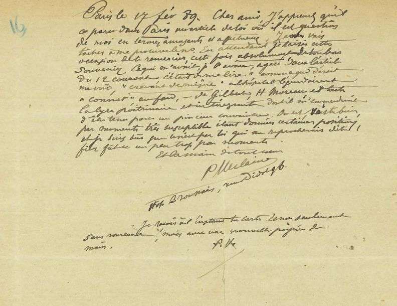 L.A.S. «P. Verlaine», Paris 17 février 1889, à son ami Edmond
