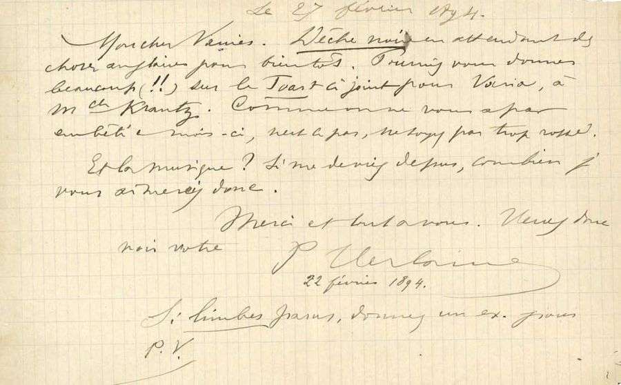 L.A.S. «P. Verlaine», 27 février 1894, à son éditeur Léon VANIER| 1 page oblong in-8.