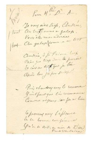 Dans la marge en bas, Verlaine a dessiné à la mine de plomb un petit soldat (ou policeman). Dans la marge en haut, Albert Messein a inscrit un certificat d'authenticité.