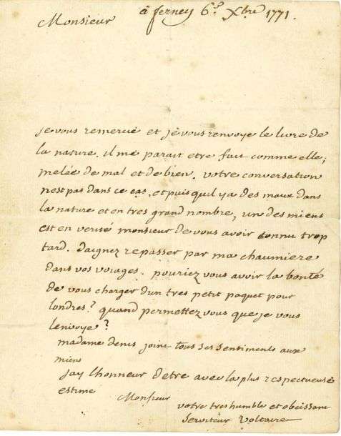 «Je vous remercie et je vous renvoye le livre de la nature [De la Philosophie de la Nature, ou Traité de morale pour l'espèce humaine tiré de la philosophie et fondé sur la nature, 1770, de DELISLE DE SALES ?]. Il me parait etre fait comme elle| melée de mal et de bien. Votre conversation nest pas dans ce cas, et puisquil y a des maux dans la nature et en tres grand nombre, un des miens est en verité monsieur de vous avoir connu trop tard. Daignez repasser par ma chaumiere dans vos voiages.