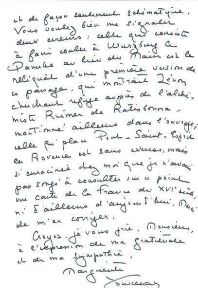 26 juin 1968. Elle vient de lire son article de Carrefour sur L'OEuvre au noir: «Vous pensez bien qu'il m'a infiniment touchée. J'ai été surtout très sensible à votre analyse si poussée des rapports entre Zénon et le Prieur des Cordeliers, ce dialogue entre l'athée (ou virtuellement tel) et le chrétien, qui ne pouvait guère à l'époque avoir lieu qu'avec d'infinies réticences de la part du premier de ces deux interlocuteurs [...] Pour moi aussi, ces pages se situent tout au centre du livre - et je vous sais le plus grand gré d'avoir si admirablement dégagé l'essentiel de ce que j'ai voulu faire, sinon de ce que j'ai fait. Sans cesse en vous lisant j'ai eu le sentiment d'être jugée par quelqu'un qui connaît aussi bien et sans doute mieux que moi cette époque passionnante et confuse qu'on représente si souvent en gros et de façon seulement schématique»... Elle s'explique sur deux erreurs signalées par Pia... 15 août 1971. Son essai sur Denier du rêve est si riche et si complet «que je me sens obligée de vous dire plus longuement merci. Tout écrivain tend, je crois, à ranger ses critiques dans diverses catégories», dont «ceux, rarissimes, doués d'un sens de la vie humaine, ceux qui analysent et jugent l'interprétation que l'auteur a essayé de donner de celle-ci. Et un tel sens suppose aussi celui du moment exact où les événements ont eu lieu, donc de l'histoire, même si l'histoire comme dans Denier du Rêve n'est située qu'à la distance, déjà immense, d'une quarantaine d'années»... 8 juillet 1974.