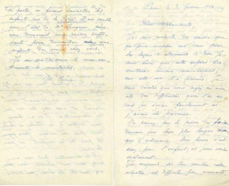L.A.S. «M. Curie», Paris 3 février 1914, à une demoiselle| 2 pages et demie in-8 à l'encre bleue (petite tache à la dernière page).