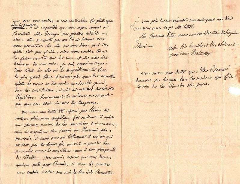 Mde Halotel qui est allée la voir lui a parlé du magnétisme, et elle a temoigné le plus grand desir d'en essayer, et l'esperance d'en obtenir du soulagement. Mde Halotel lui ayant dit que je lui procurerois quelqu'un pour le magnetisme, elle a repondu qu'elle avoit la confiance que vous voudriez bien lui rendre ce service»... Il donne des instructions pour se faire admettre auprès d'elle| «le magnétisme lui fera le plus grand bien, d'autant plus que la commotion qu'elle a reçue a du porter un trouble général dans la constitution, et qu'il est essentiel de rétablir l'équilibre»...