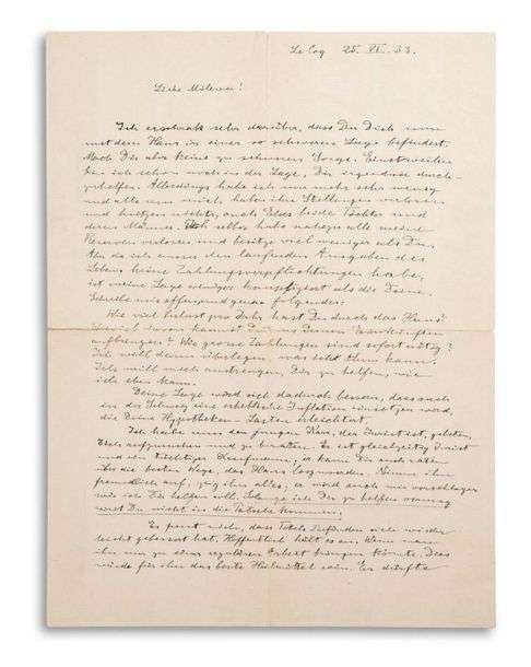 L.A.S. « Albert », Le Coq [Belgique] 25 juin 1933, à son ex-femme Mileva MARI?-EINSTEIN | 1 page et demie in-4 (plis fragiles) | en allemand