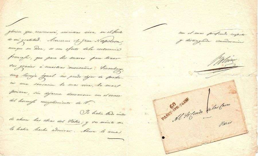 Il vient de recevoir l'ouvrage immortel qui traversera les siècles, portant les noms réunis du grand homme et de l'écrivain et ami fidèle («la obra immortal que pasará por entre los siglos llevando juntos los nombres del grand hombre y del escritor - amigo fidel»). La lettre qui accompagnait les entretiens de Sainte-Hélène est un document glorieux qu'il conservera tant qu'il vivra au fond de sa gratitude. Se rapprocher du grand Napoléon, même en idée, est un effet de la courtoisie française qui traverse les mers pour apporter ses grâces dans leurs montagnes («Acercarme el gran