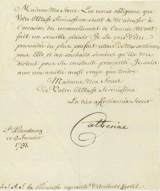 L.S. «Catherine», Saint-Pétersbourg 9 janvier 1793, à sa belle-soeur, S.A.S. la princesse régnante d'ANHALT-ZERBST, Frédéric-