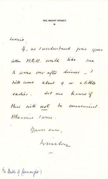Si, comme il croit comprendre d'après la lettre de Leonie, S.A.R. [Arthur, duc de CONNAUGHT, fils de la Reine Victoria, longtemps amant de Lady Leslie] souhaite qu'il vienne après dîner, Winston viendra vers 21 h, ou un peu plus tôt. Qu'elle lui fasse savoir si cela ne convient pas...