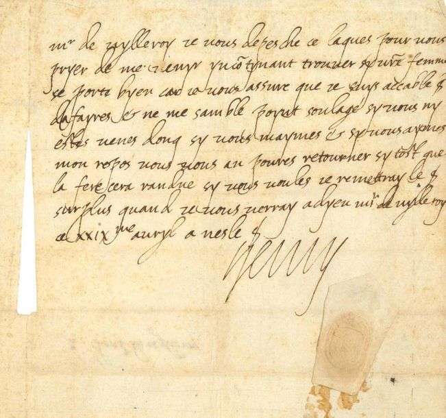«Mr de Vylleroy je vous depesche ce laques pour vous pryer de me venyr incontynant trouver sy vostre femme se porte byen car je vous assure que je suys accablé dafayres et ne me semble poynt soulagé sy vous ny estes venes donq sy vous maymes & sy vous aymes mon repos vous vous an poures retourner sytost que la fere cera randue sy vous voules je remettray le surplus quand je vous verray»...