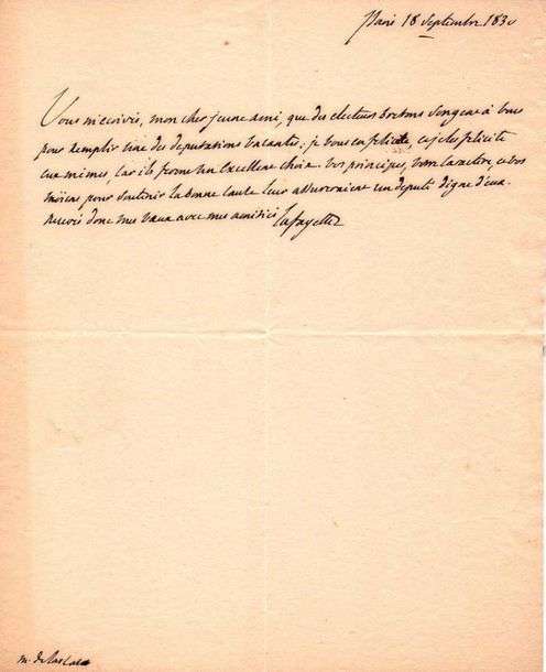 L.A.S. et L.S. «Lafayette», Paris 1830-1832, à Emmanuel de LAS CASES fils| demi-page in-4 chaque, une adresse.