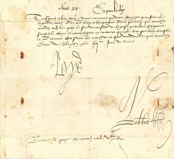 L.S. «Loys», Blois 12 mars [1511], à «Noz treschers et bien amez les Bourgeoys manans et habitans de nre bonne ville et cité de Lyon»| contresignée par Florimond ROBERTET| 1 page in-4, adresse au verso avec traces de sceau cire rouge.
