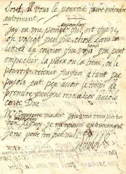 Jay eu une pensée aujourduy qui est que si on voyioit quelque chose dans les lettres du courrier que vous savés qui peut empecher la paix ou la treve, on le pouroit retenir jusques a tant que Pujols eut peu avoir le temps de prendre quelque resolution avec le conte Duc»...