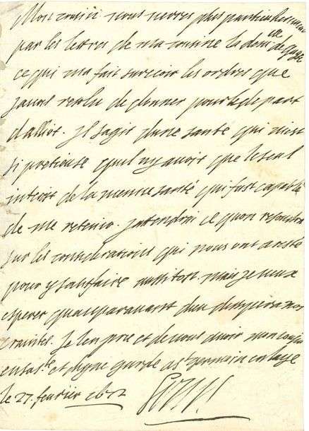 «Mon cousin vous verres plus particulierement par les lettres de ma cousine la demlle de Gages ce qui ma fait surceoir les ordres que javois resolu de donner pour le depart d'Alliot. Il sagit d'une santé qui m'est si pretieuse quil ny avoit que le seul interest de la mienne santé qui fust capable de me retenir. J'attendrai ce qu'on repondra sur les considerations qui nous ont aresté pour y satisfaire aussitost. Mais je veux esperer quauparavant Dieu dissipera nos craintes»...