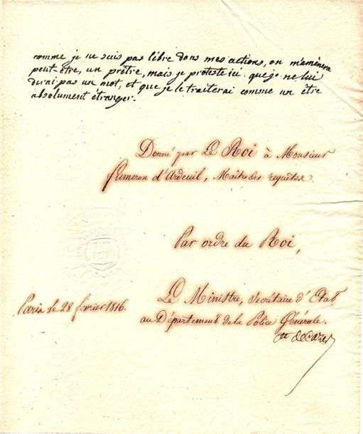 Fac-similés lithographiés de leur testament, avec envois signés par le comte Élie DECAZES, Paris 10 avril et 28 février 1816| 7 pages in-4 sur papier filigrané à l'effigie de Louis XVIII et aux armes royales, cachets secs aux armes.
