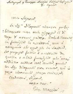 L.A.S. «Gius. Mazzini», 8 avril, à «Moi Signore»| 1 page petit in-12 (trace de collage au dos)| en italien.