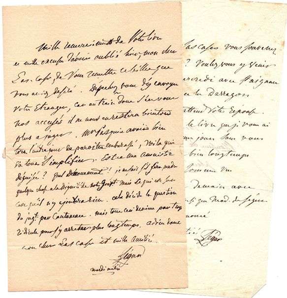 Mercredi matin. Il le prie d'aller voir MARCHAND qui «est ici avec le gl Brayer», 6 rue de Provence: «obtenez-en tous les détails possibles par écrit. Quand vous aurez eu ces détails sur Ste Hélène, s'il a fait la campagne de 1814 avec l'empereur je tâcherai de le voir aussi. Mais j'aime mieux vous laisser faire tout seul d'abord parce qu'il aura sans doute une confiance entière en vous. Connoissezvous la demeure des autres valets de chambre de l'empereur qui peuvent être à Paris ?»... Mardi matin [décembre 1841 ?]. Remerciements pour son livre [Journal écrit à bord de la frégate «la Belle