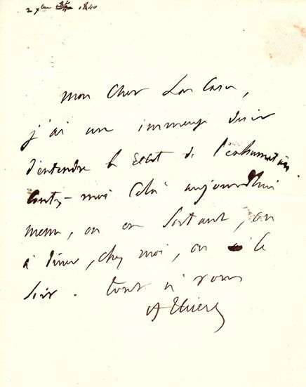Mercredi 18 mars. Il regrette d'avoir manqué sa visite. «Vous savez quel plaisir, j'aurai toujours à vous entretenir»... Lundi 6 avril. «Je voudrais bien avoir une petite visite de vous, ce soir vers neuf heures»... [2 décembre]. «J'ai un immense désir d'entendre le récit de l'exhumation [de Napoléon]. Contez-moi cela aujourd'hui même, ou en sortant, ou à dîner, chez moi, ou le soir»...