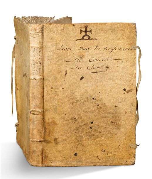 France, Savoie, Chambéry, 1732-1737 Petit in-folio, 190 ff. (texte seulement aux ff. 2 à 4, 7 à 11, 100 à 113 et 151 à 152), en français à l'encre brune sur papier. Reliure d'époque de plein parchemin rigide, lanières, dos à cinq nerfs titré «Livre du Reglement du concert de Chambery du 23e 9bre 1732» (tâches et salissures sur les plats| quelques rousseurs). Dimensions: 352 x 227 mm.