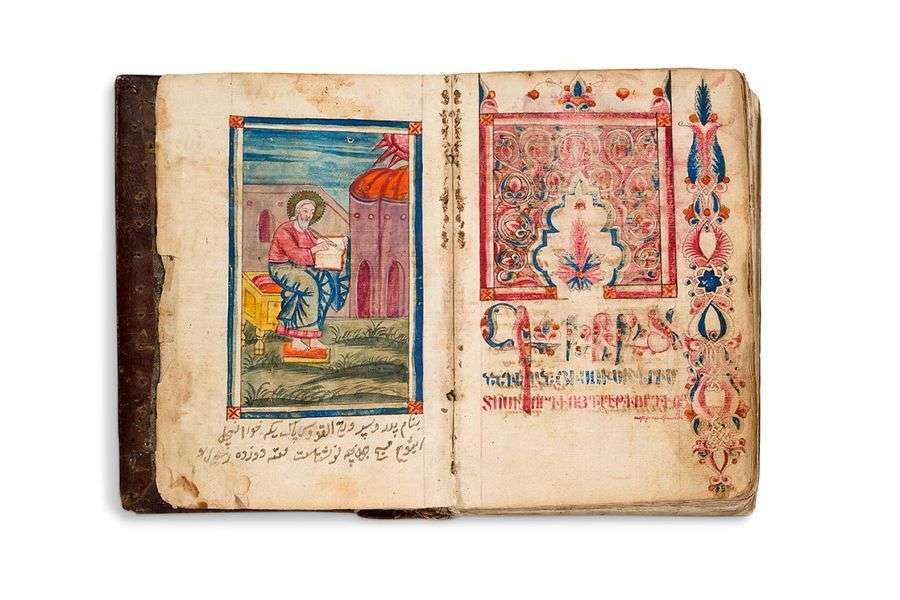 In-12 (16 x 11,5 cm), 205 ff. à l'encre brune et rouge, et gouache sur papyrus. Reliure postérieure en basane à rabat originellement cloutée (traces de perforations), garde intérieure en tissage oriental bleu| en arménien ancien et quelques mots en arabe en bas de l'enluminure.