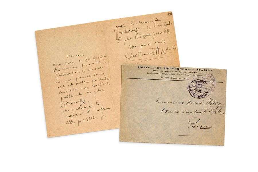 Lettre autographe signée du poète Guillaume Apollinaire adressée à un poète pour lequel il a donné un article dans le journal L'Intransigeant.