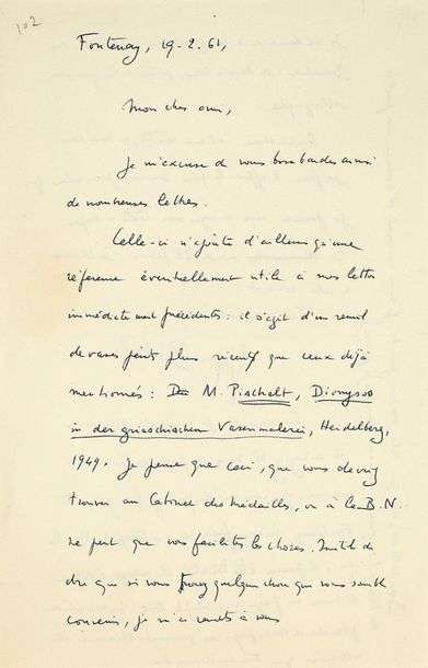 «[...] je m'excuse de vous bombarder ainsi de nombreuses lettres [...] Il s'agit d'un recueil de vases peints plus récents que ceux déjà mentionnés [...] Je pense que ceci, que vous devriez trouver au Cabinet des Médailles, ou à la B. N. ne peut que vous faciliter les choses. Inutile de dire que si vous trouvez quelque chose qui semble vous convenir, je m'en remets à vous [...]».