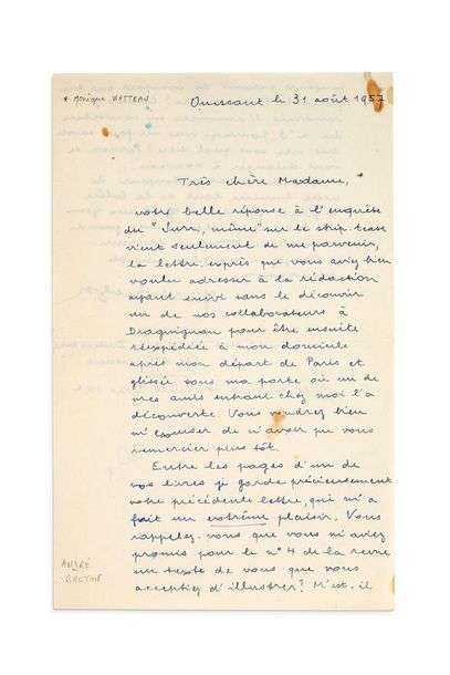 Lettre autographe signée adressée à Monique WATTEAU Ouessant, 31 août 1957. 2 pages in-8 à l'encre sur papier (papier partiellement décoloré et quelques taches).