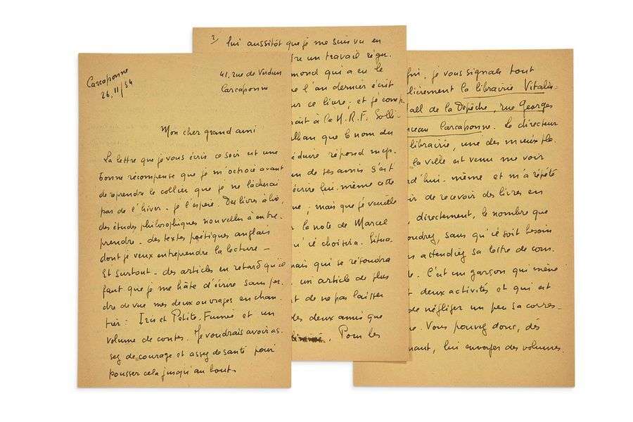 Lettre autographe signée adressée à «mon cher grand ami» 26 novembre 1934, 6 pages in-8 à l'encre sur papier jonquille.