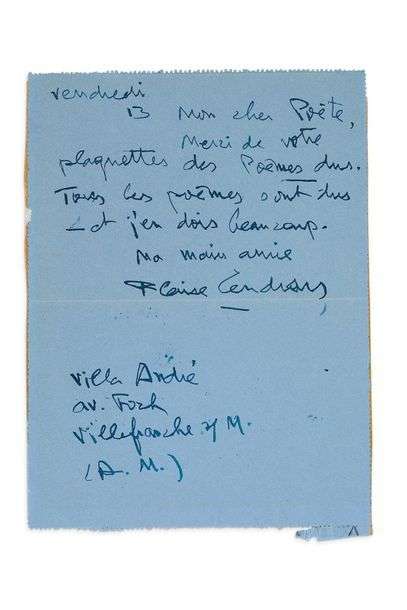 Billet autographe signé adressé à Claude SERNET Villefranche, vendredi 13 [circa 1949], 1 page in-8 à l'encre sur papier bleu.
