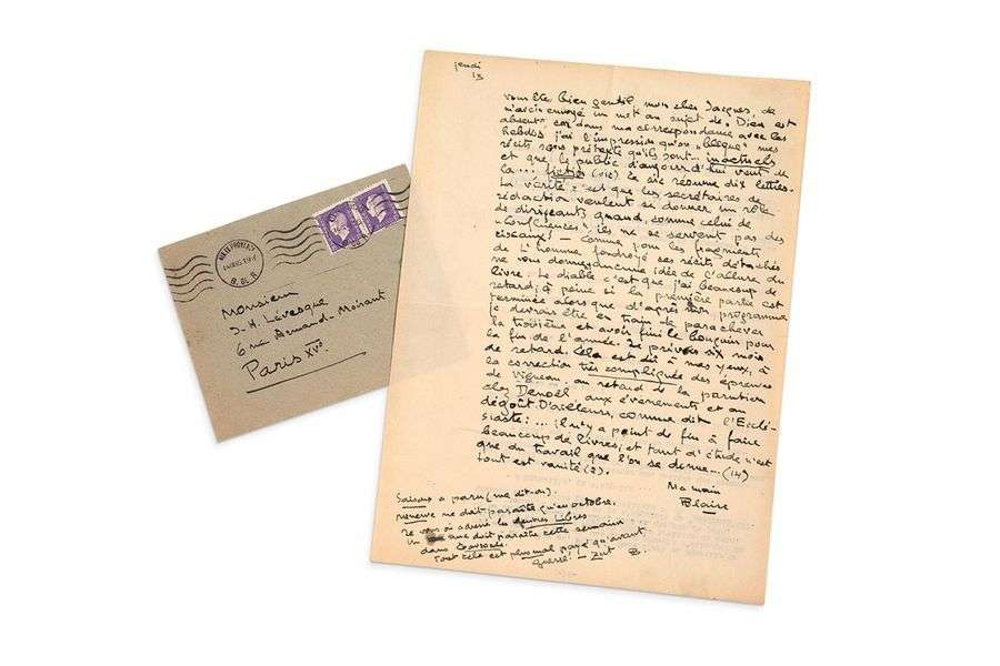 LÉVESQUE Aix-en-Provence, 13 [septembre 1945]. 1 page in-4 à l'encre brune sur papier au verso d'une page dactylographiée de L'Homme foudroyé, enveloppe conservée.