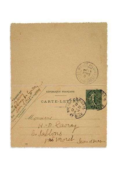 Carte-lettre autographe signée adressée à H. D. DEVRAY S.l., [13 septembre 1904], 1 page in-12 à l'encre, adresse manuscrite au verso et resignée de son nom (papier bruni).