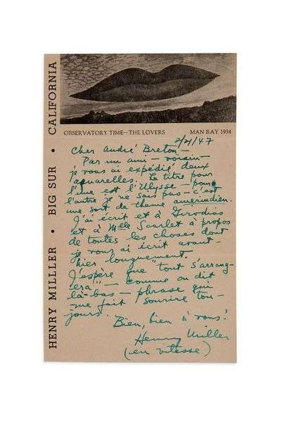 BRETON Big Sur (Californie), 2 février 1947. 1 page in-8 à l'encre verte sur carton à entête illustré par la reproduction de «A l'heure de l'observatoire, les amoureux»| en français.