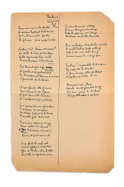 Poème de 11 quatrains à l'encre titré «Tambour» par Raymond Radiguet, d'inspiration érotique.