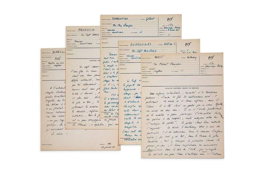 Cinq manuscrits autographes signés, fiches de lecture pour les éditions Gallimard