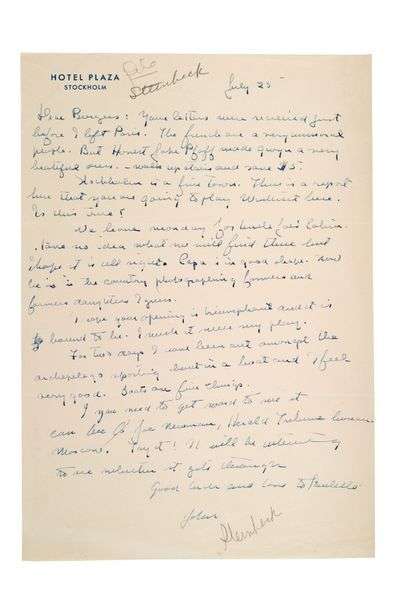 L.A.S. « John », Stockholm 25 juillet [1947], à Oliver BURGESS MEREDITH | 1 page in-4 à en-tête Hotel Plaza Stockholm | en anglais.