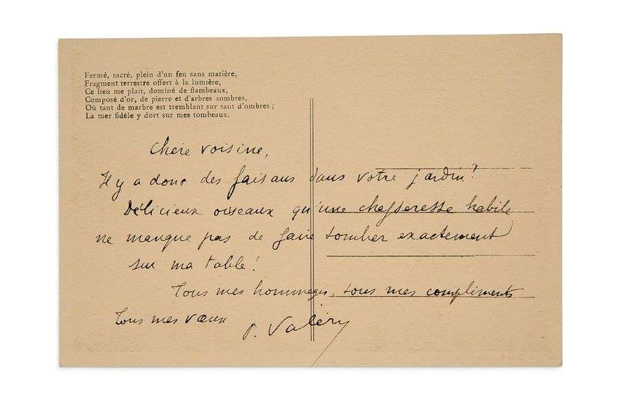 Carte postale spirituelle signée par Paul Valéry adressée à la célèbre salonnière Jeanne Muhlfeld.