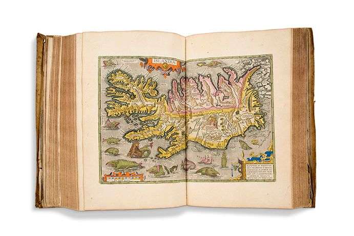 I-XL, ff. d'impression). Titre-frontispice allégorique gravé à la main, avec gravure en pleine page des armes du royaume d'Espagne au verso, mémorial à Ortelius, portrait gravé d'Ortelius, et frontispice architecturé (Parergon), 151 cartes gravées rehaussées de couleurs, dont 38 dans le Parergon. Le tout monté sur onglets et magnifiquement rehaussé à la main de couleurs vives et d'or, lettrines gravées sur bois coloriées.